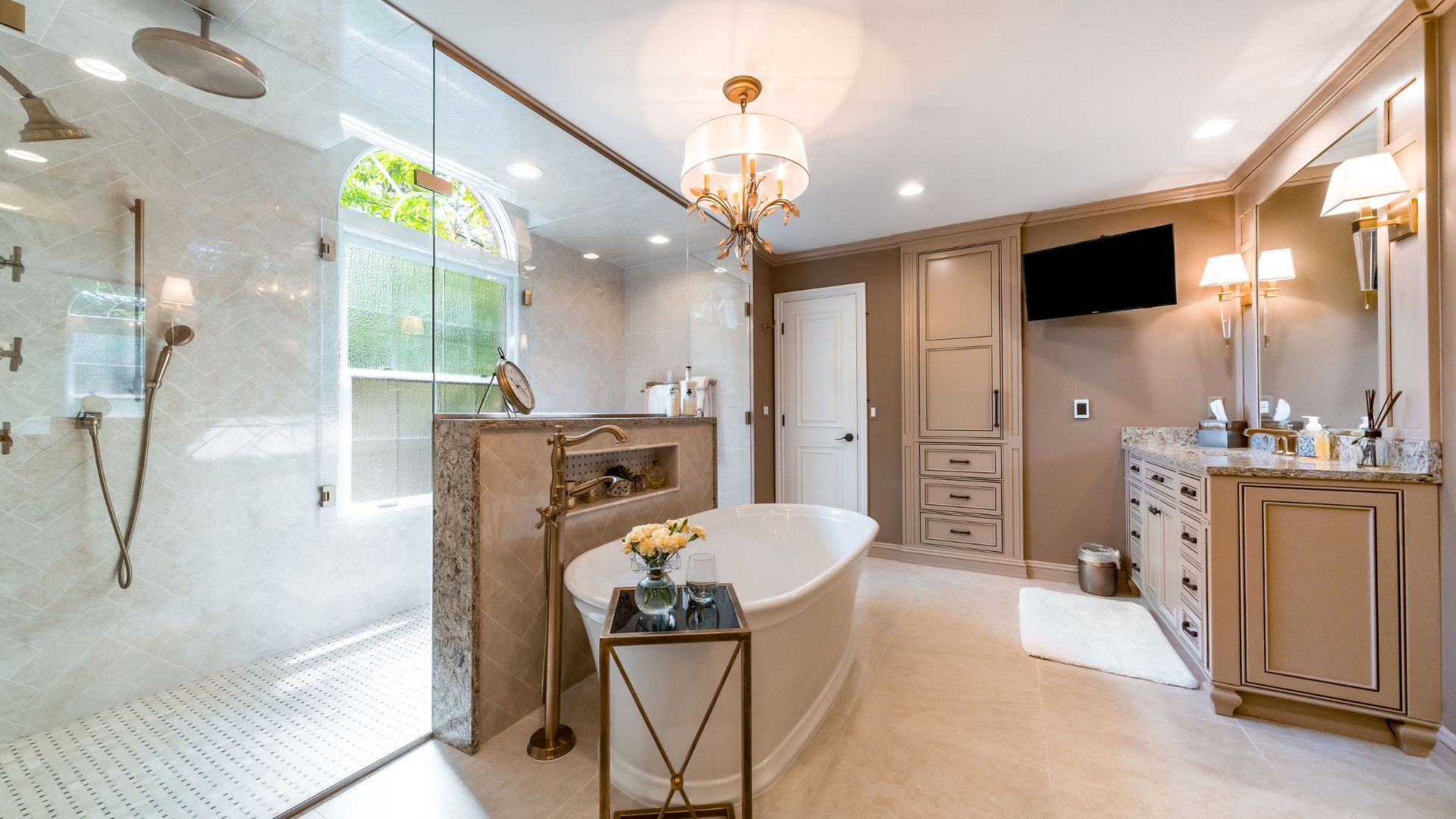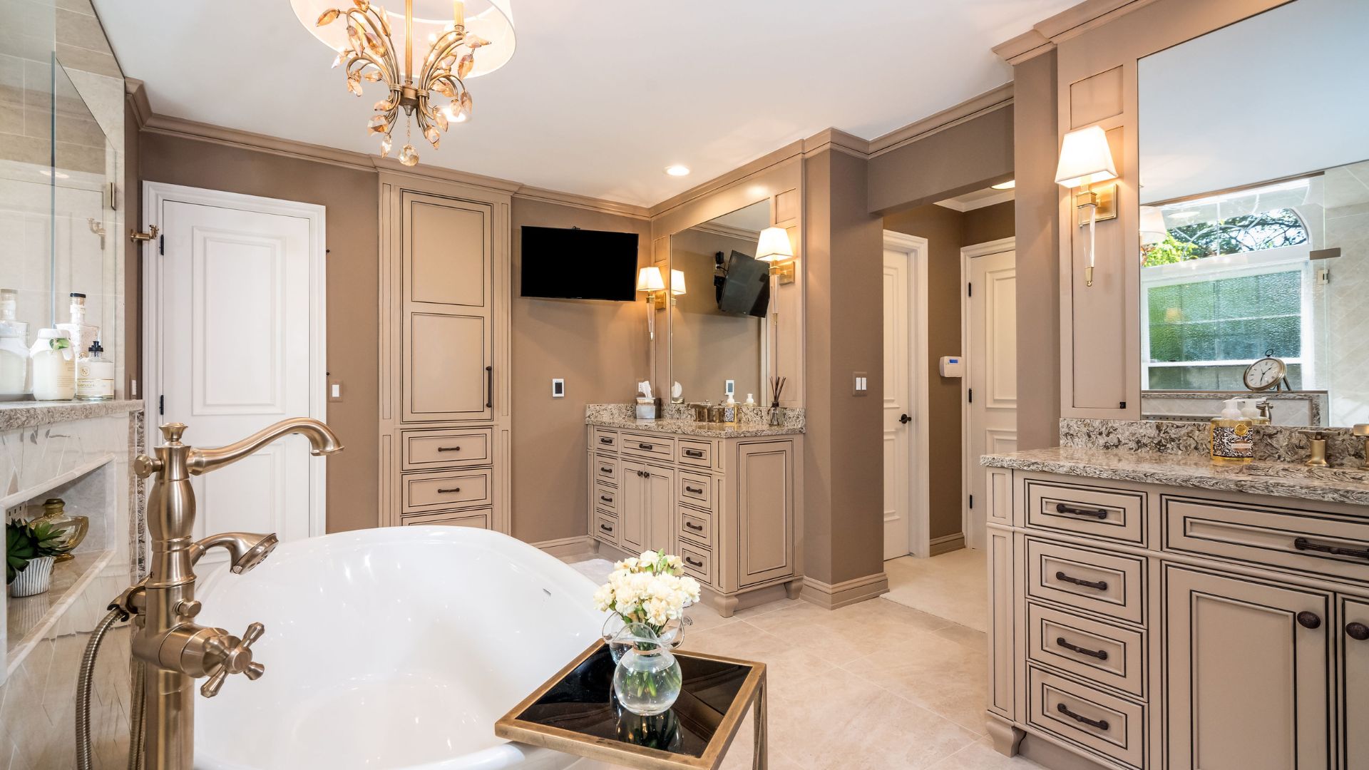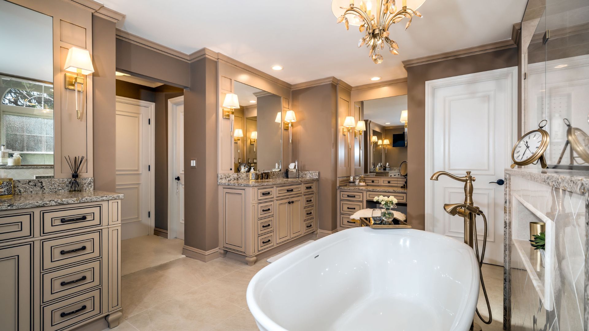 A warm neutral palette, accented with brass fixtures and crystal lighting, creates depth and sophistication. Layered lighting—including chandeliers and recessed fixtures—ensures the space feels both inviting and versatile, transitioning seamlessly from morning routines to evening relaxation.