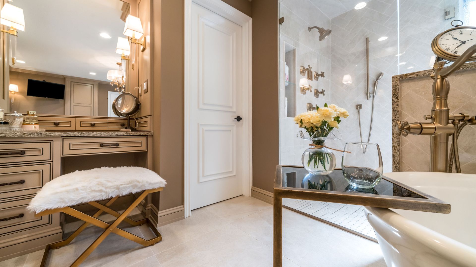 Custom vanities with intricate paneling and stone countertops provide abundant storage while enhancing the sense of symmetry and refinement. Dual sinks, integrated lighting, and a makeup vanity ensure the space is both functional and indulgent.