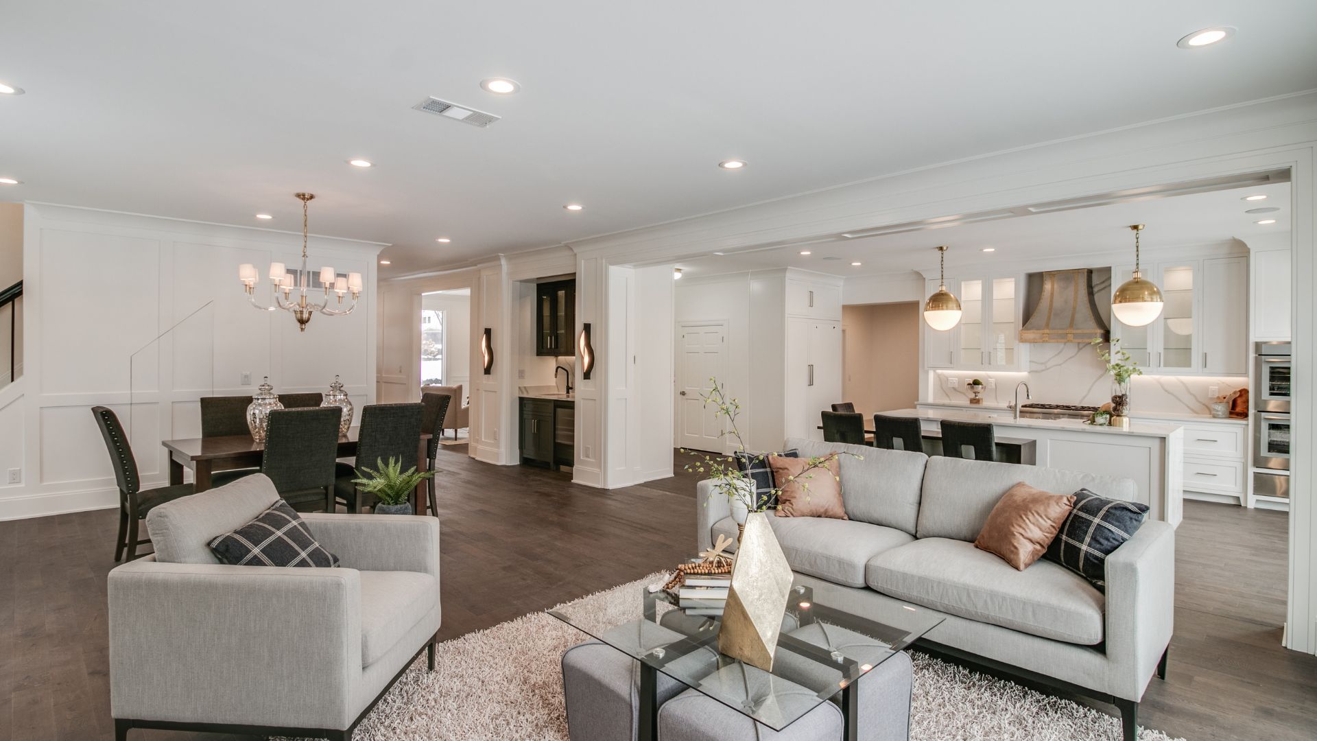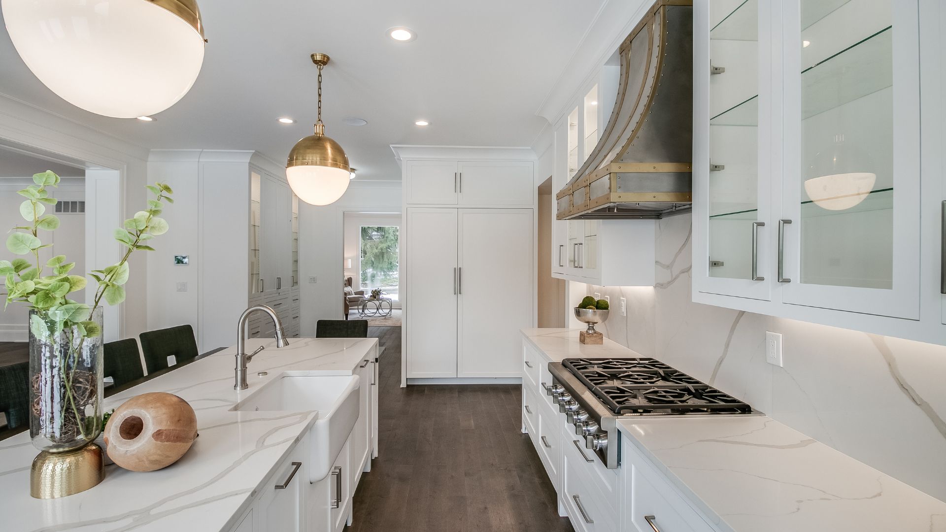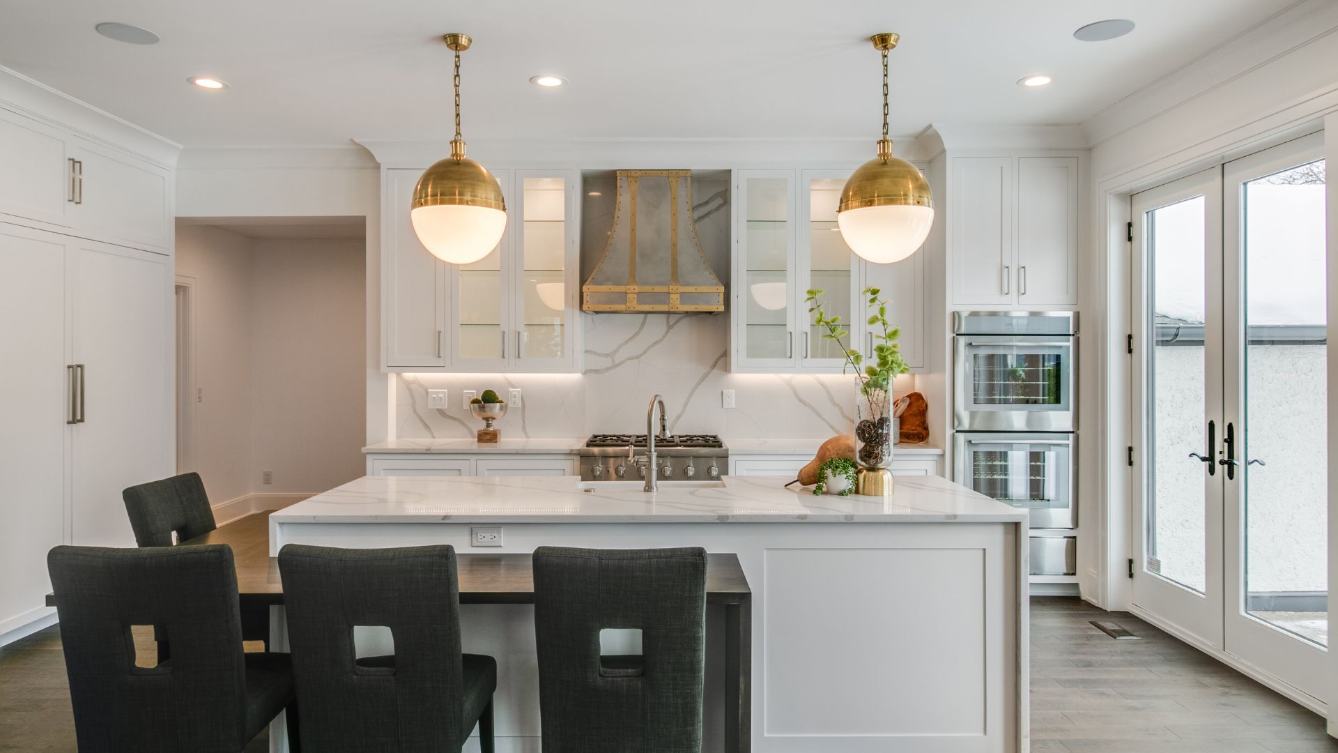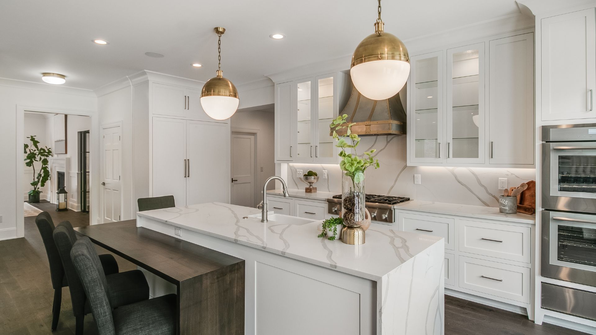 Inside, every surface was curated to create flow and harmony. From the warmth of natural hardwood floors to the elegant simplicity of crisp white millwork, the interior exudes a calm, collected atmosphere. The kitchen was designed as the heart of the home, with custom cabinetry, a statement range hood, and luxurious stone countertops that double as both a showpiece and a practical workspace.