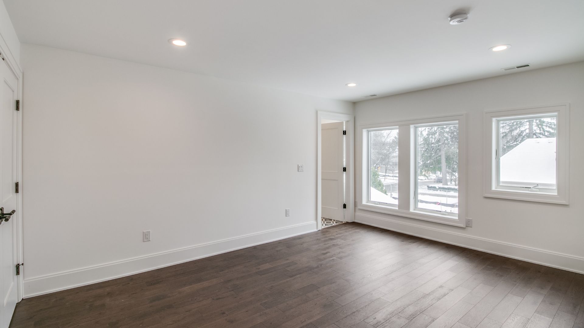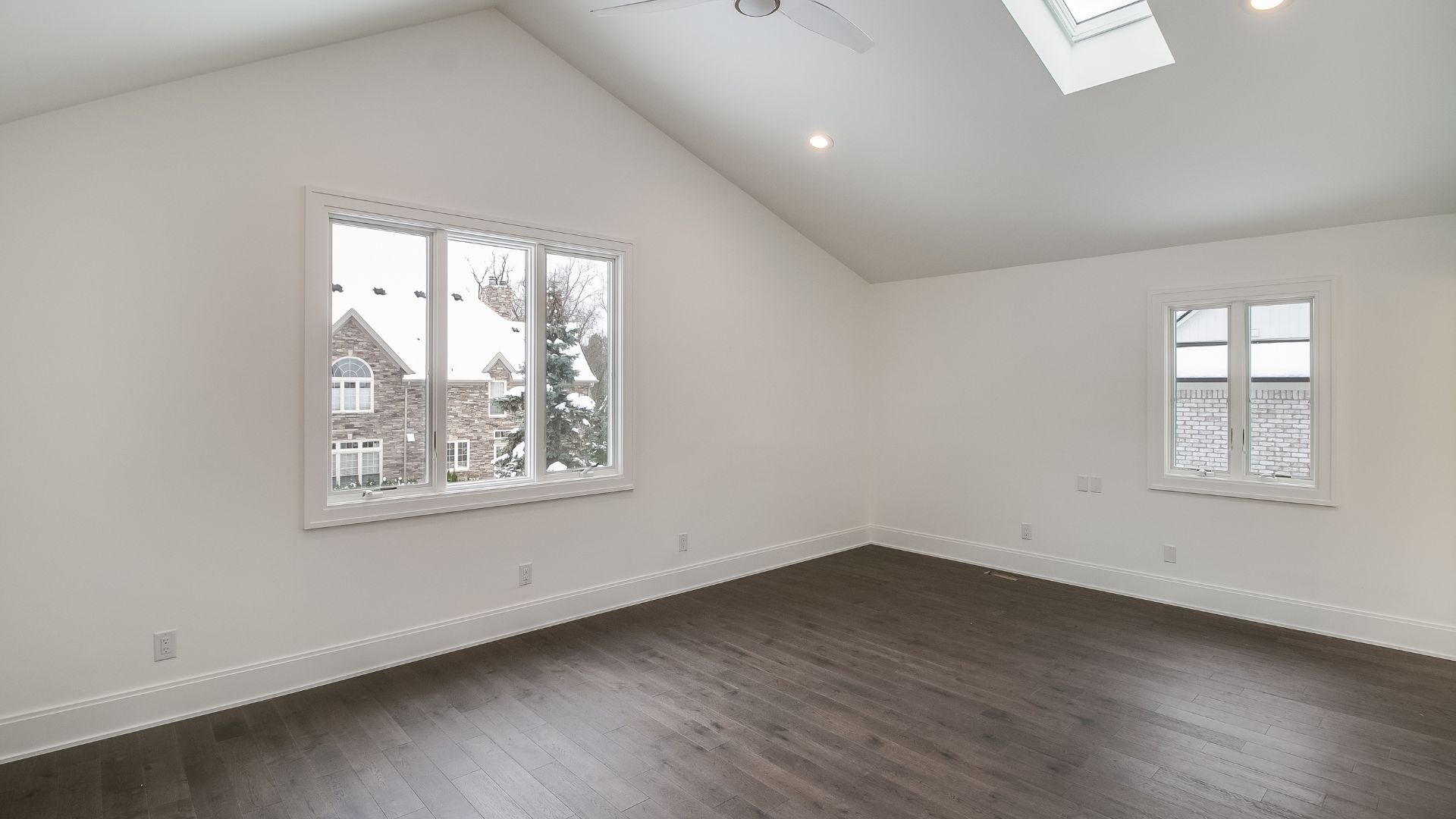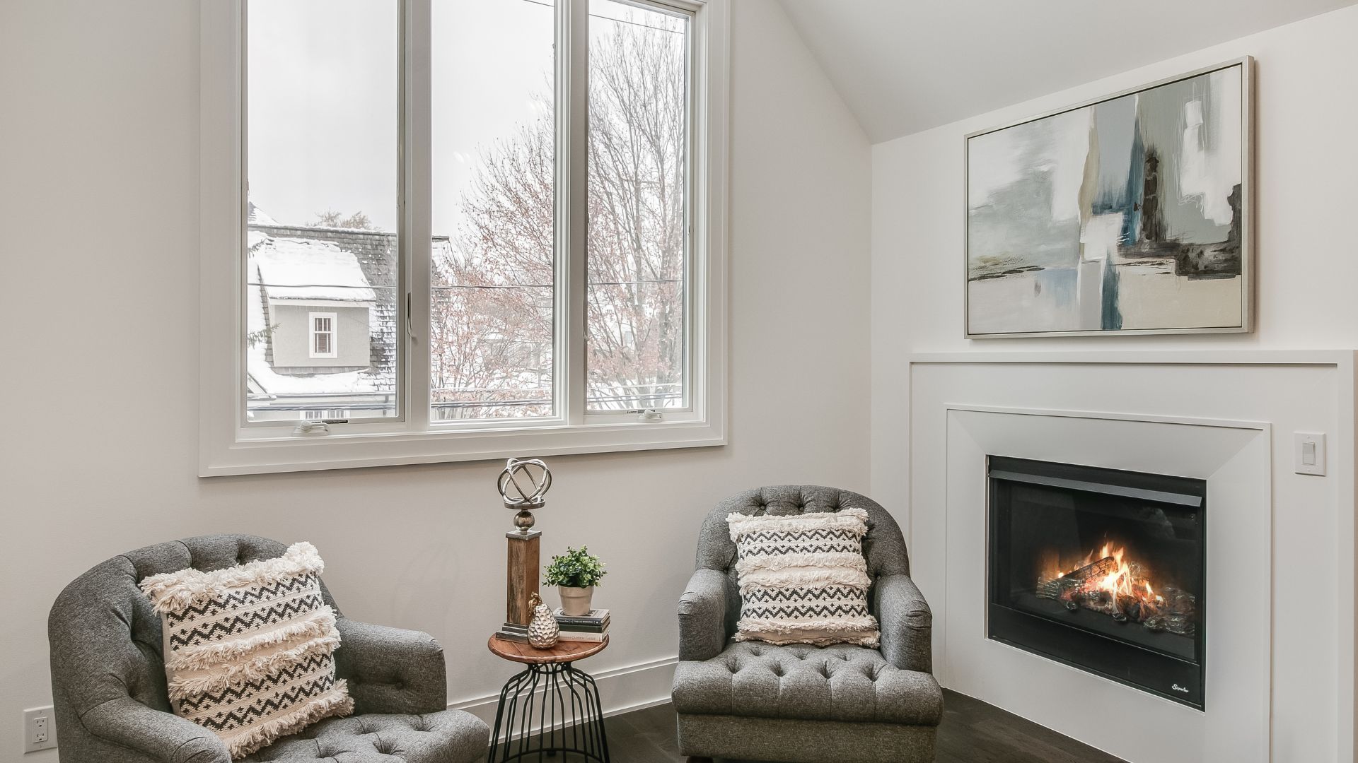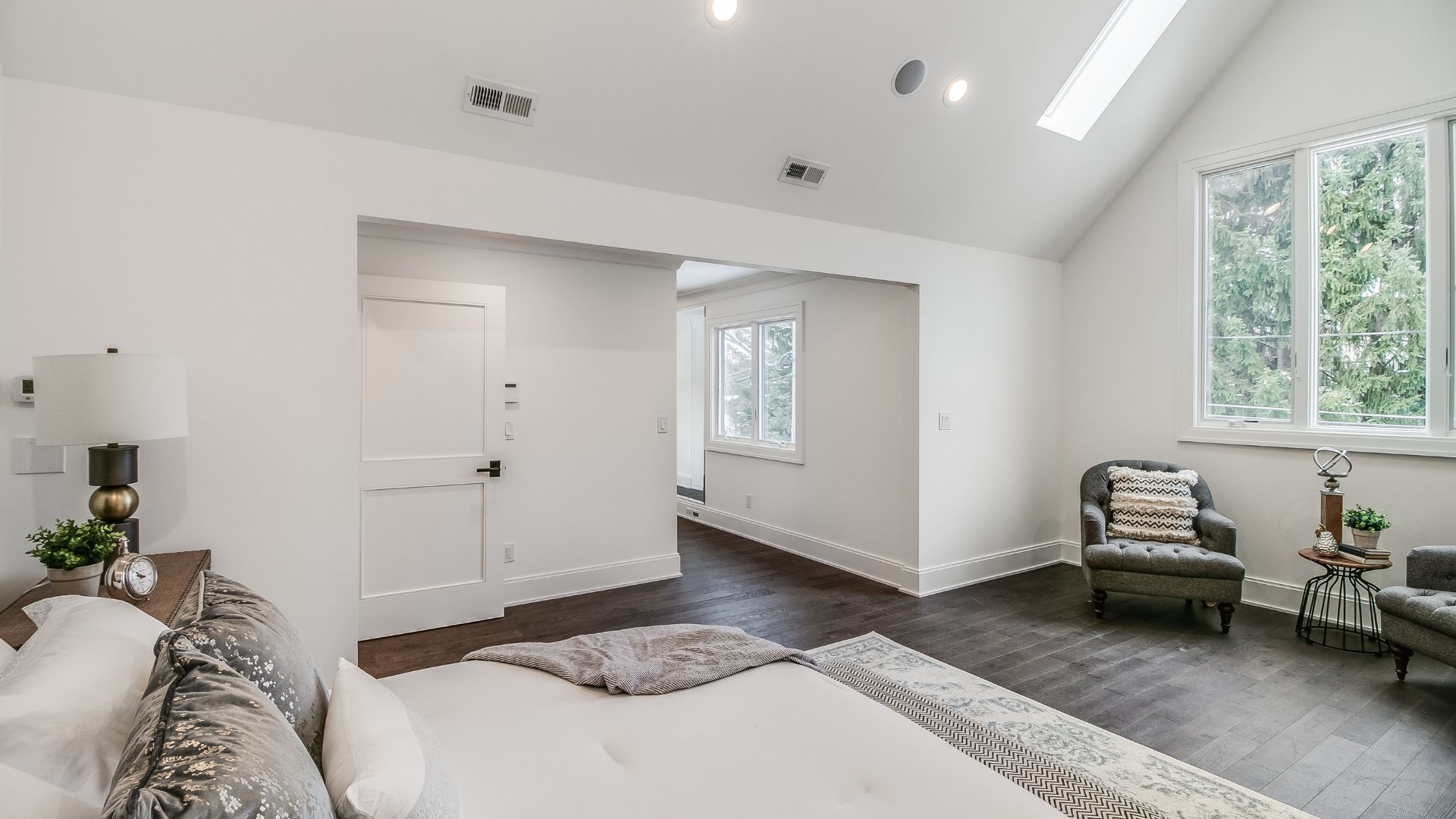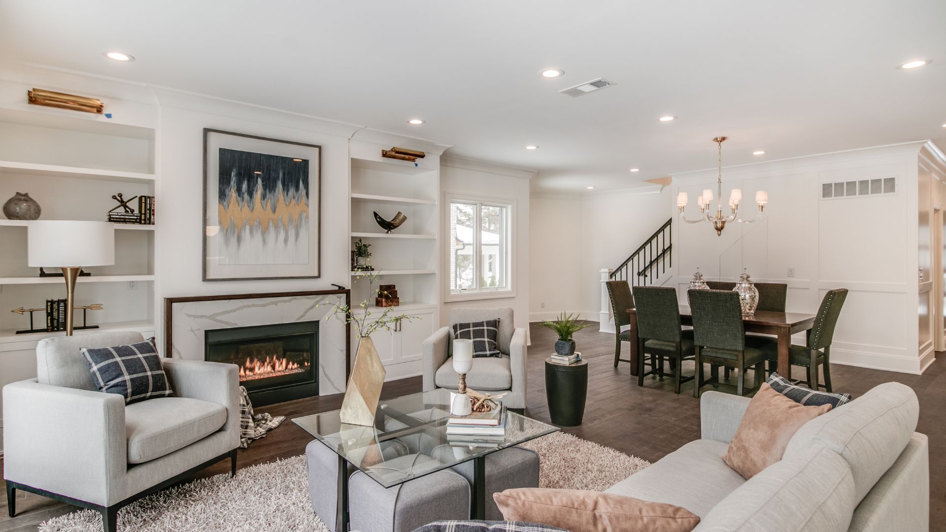Inside, every surface was curated to create flow and harmony. From the warmth of natural hardwood floors to the elegant simplicity of crisp white millwork, the interior exudes a calm, collected atmosphere. The kitchen was designed as the heart of the home, with custom cabinetry, a statement range hood, and luxurious stone countertops that double as both a showpiece and a practical workspace.