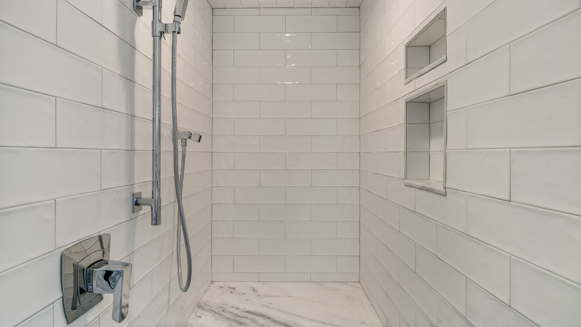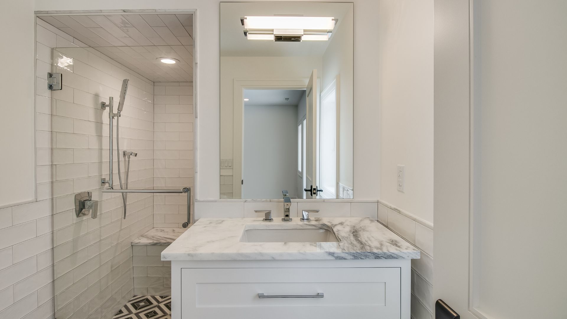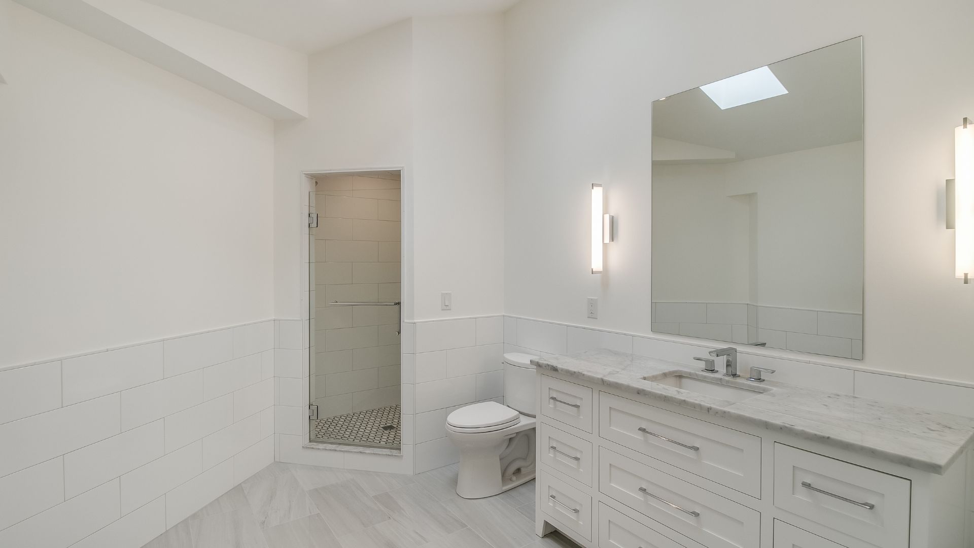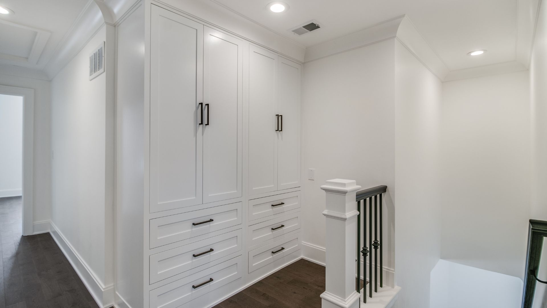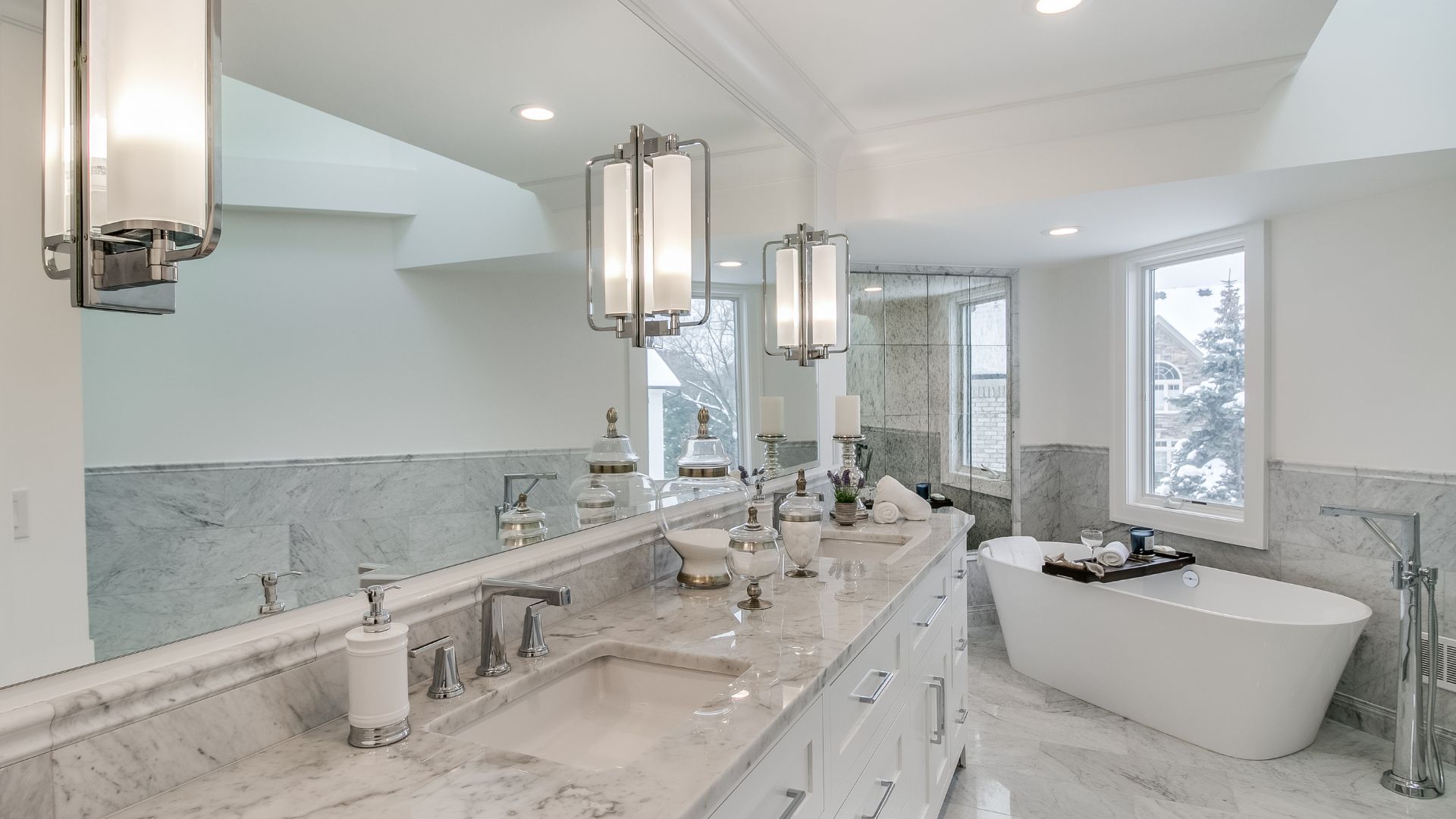 In the primary bath, marble surfaces, polished fixtures, and a freestanding tub created a serene, spa-like escape. The mudroom, laundry, and closet spaces were approached with equal attention, designed to maximize function without sacrificing elegance.