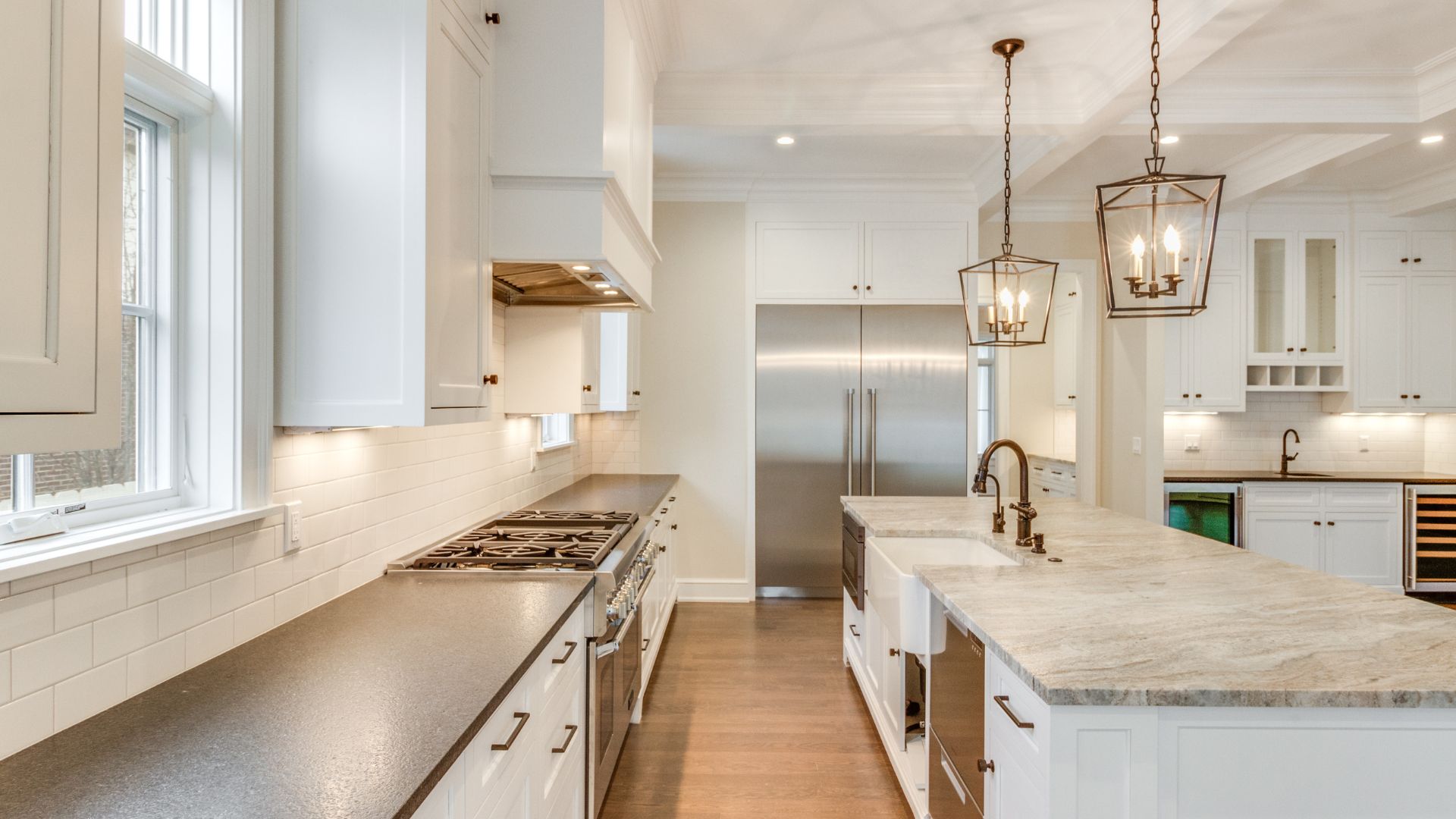 The heart of this home is a spacious kitchen layered with elegance and function. Custom cabinetry, professional-grade appliances, and dual islands maximize both prep and entertaining space. Natural stone countertops bring warmth and texture, balanced by clean white finishes and statement lighting overhead.