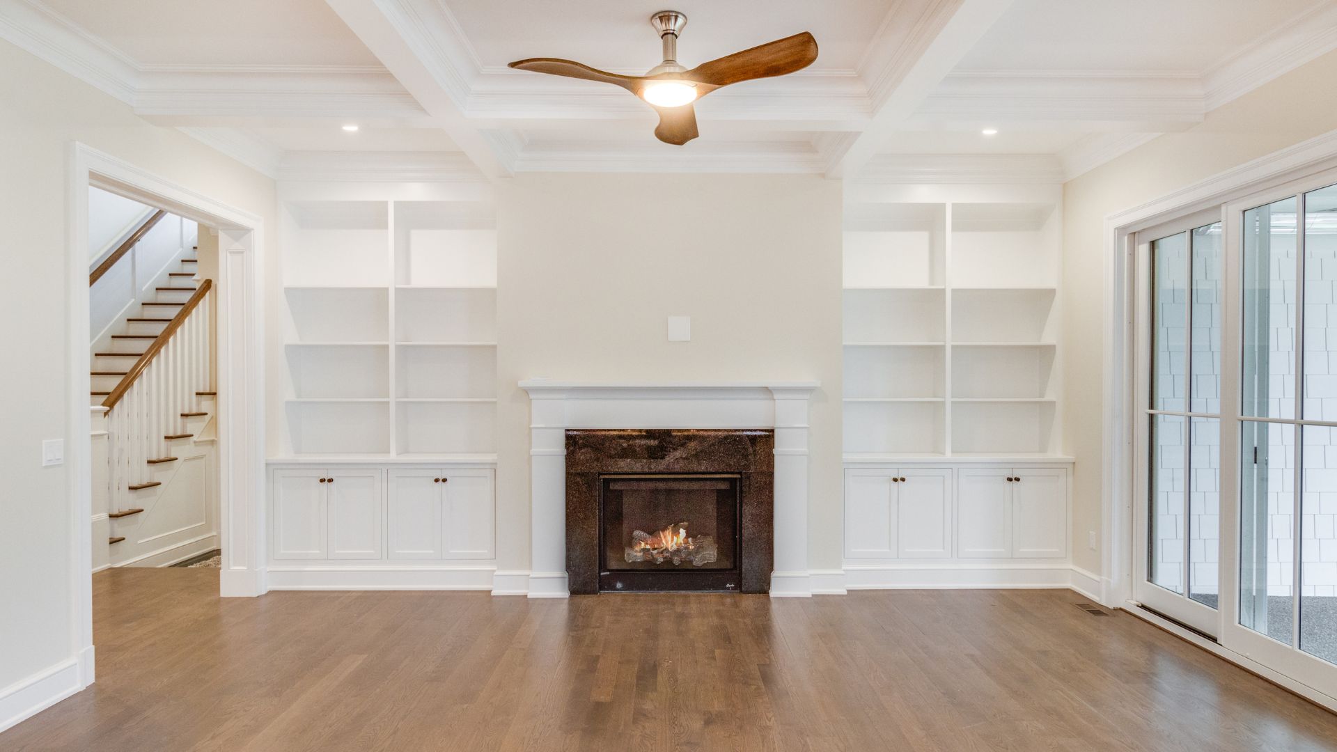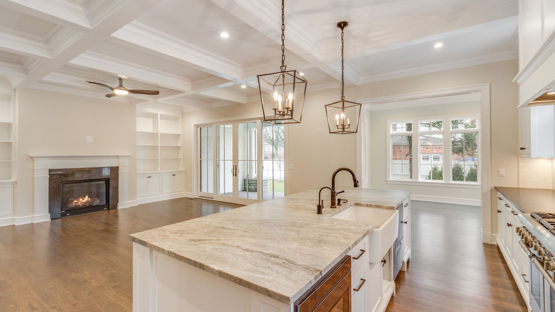 From the coffered ceilings in the family room to the custom built-ins and wide glass doors, every room was designed to feel bright, welcoming, and timeless. The home blends classic architecture with modern livability, creating spaces perfect for everyday family life as well as elegant entertaining.