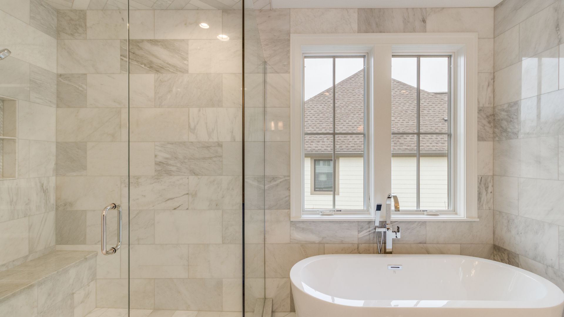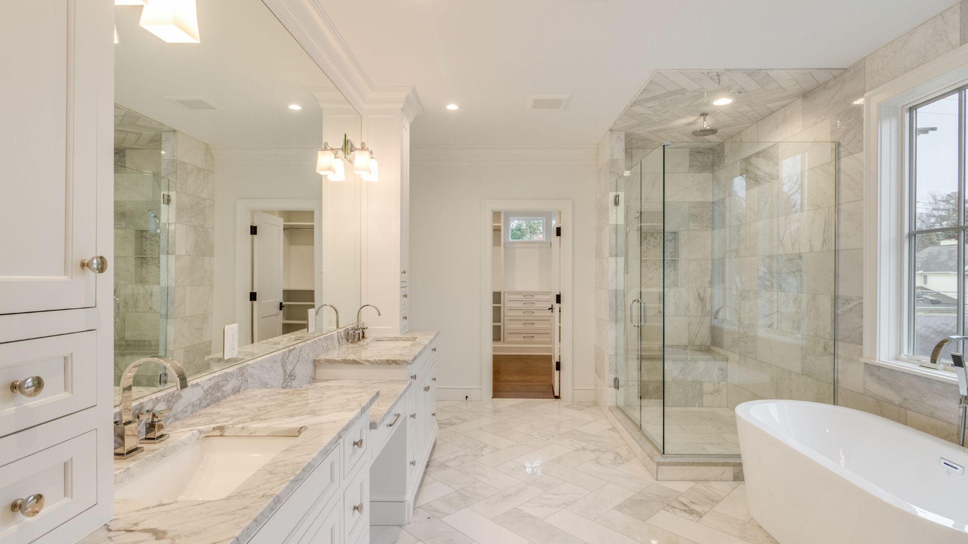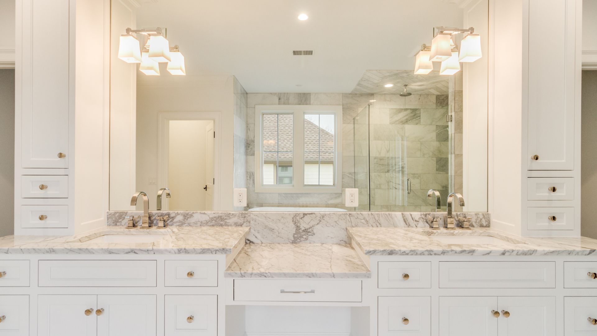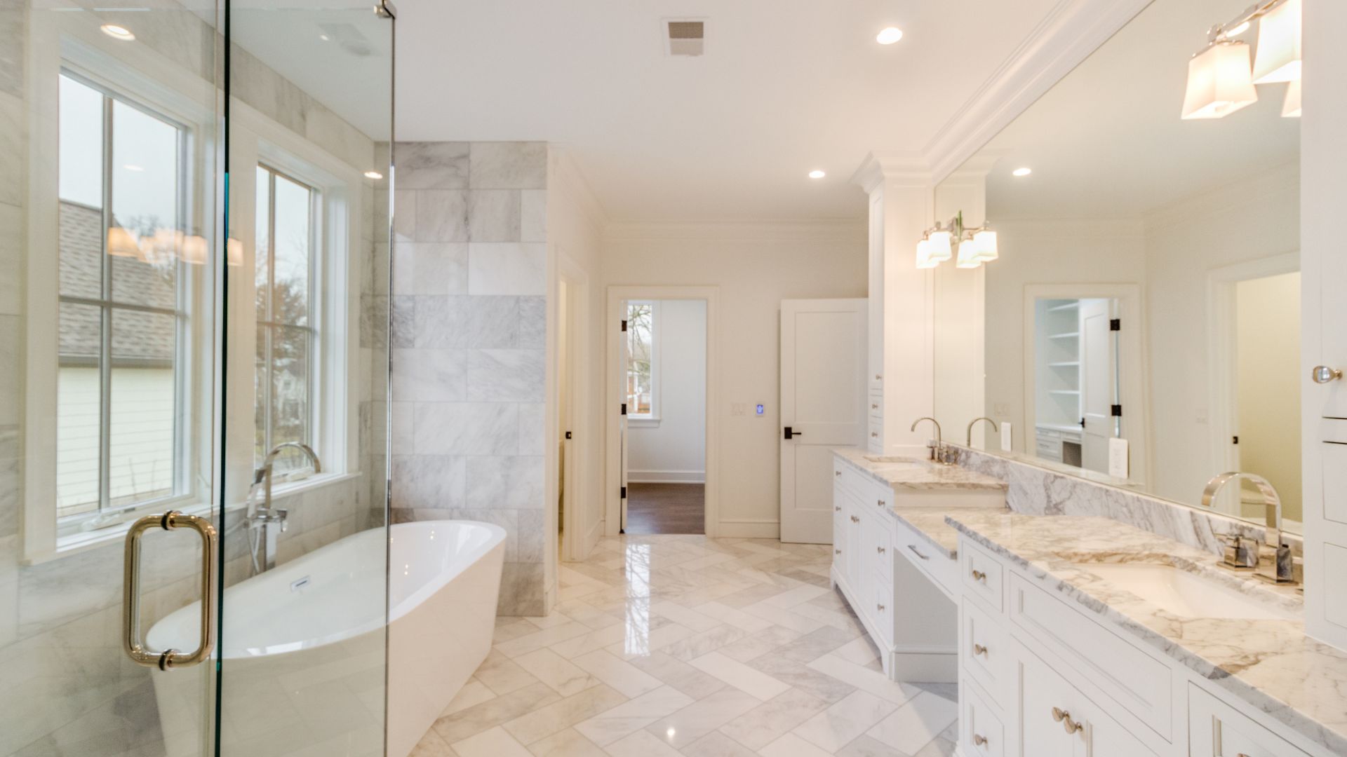 Each bathroom was designed with luxury in mind. Polished marble floors, custom vanities, and walk-in showers with detailed tilework give the home a serene, spa-like atmosphere. A freestanding tub anchors the primary bath, offering a peaceful retreat filled with natural light.
