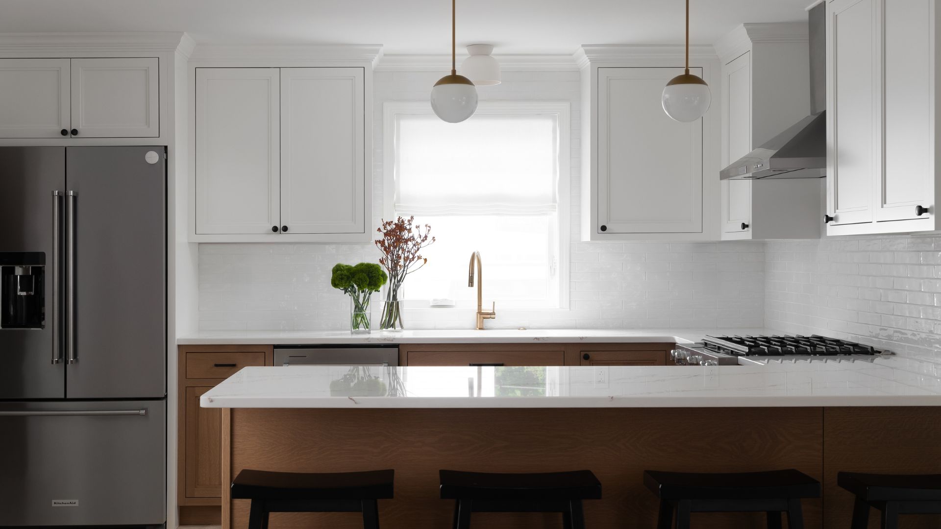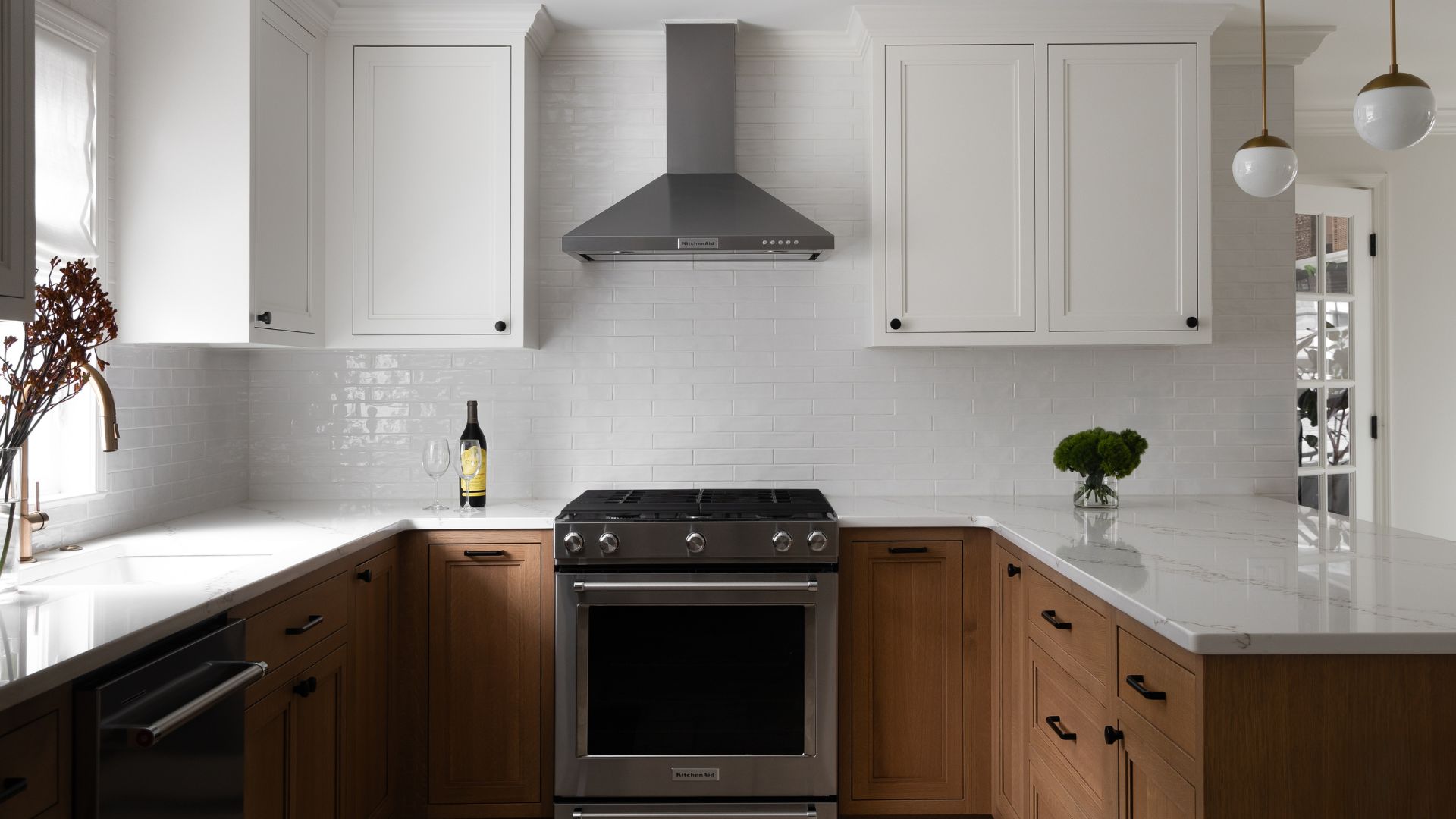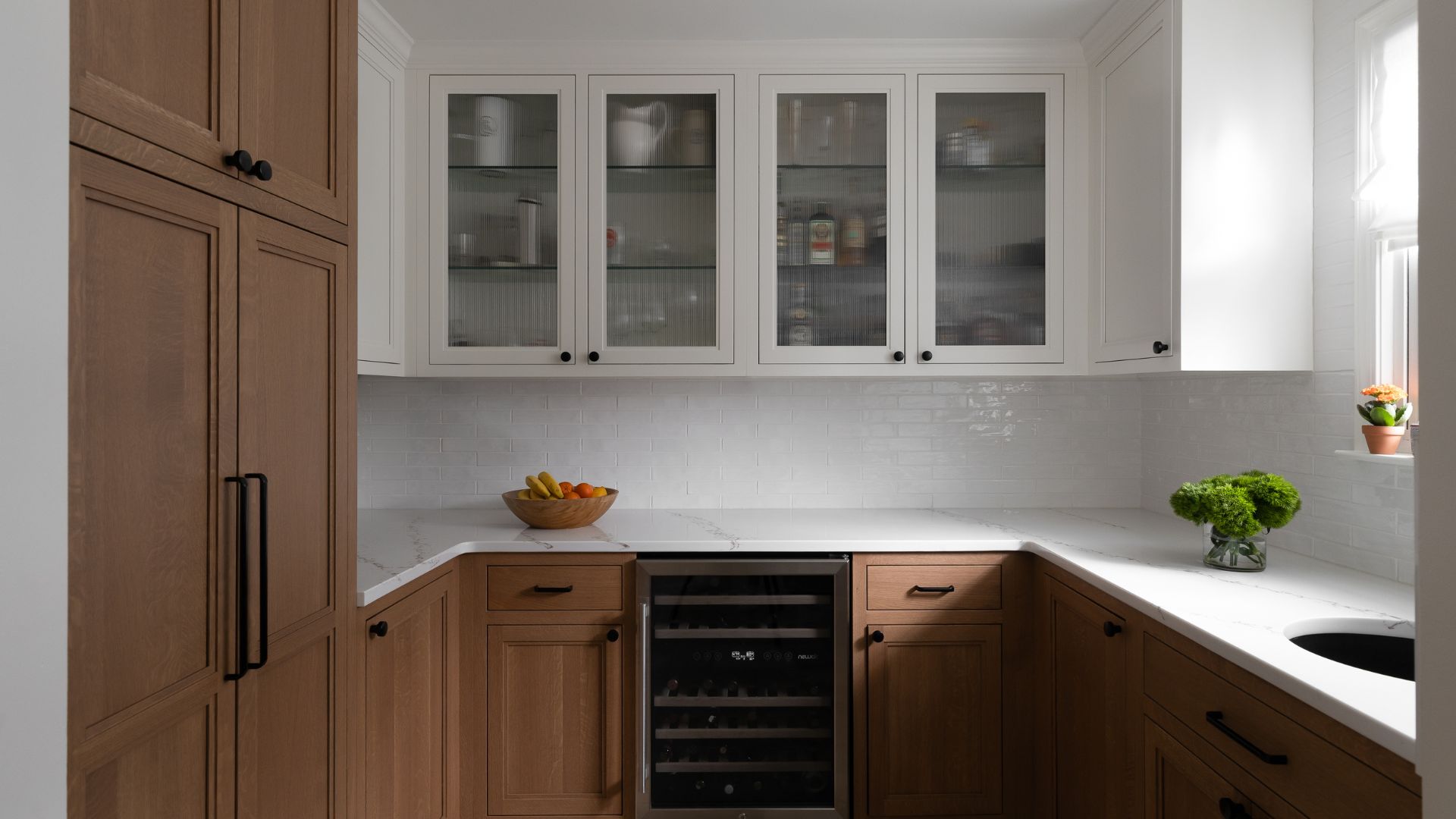 The heart of the home was completely reimagined. Amareaux embraced a two-tone cabinetry palette—warm natural wood lowers paired with crisp white uppers. This combination created an elevated, custom look while giving the illusion of a larger footprint. By closing the pantry door that once opened into the dining room (now a home office), the team reconfigured the layout for improved storage and uninterrupted cabinetry runs. High-performance appliances, including a professional-grade range, paneled refrigerator, and wine fridge, were seamlessly integrated into the cabinetry. Finishes were chosen to reflect the project’s airy and organic ethos: waterfall quartz countertops with soft veining, a full quartz backsplash for continuity, and matte black hardware for subtle contrast. Natural light now dances across the space, enhancing its open, welcoming feel.