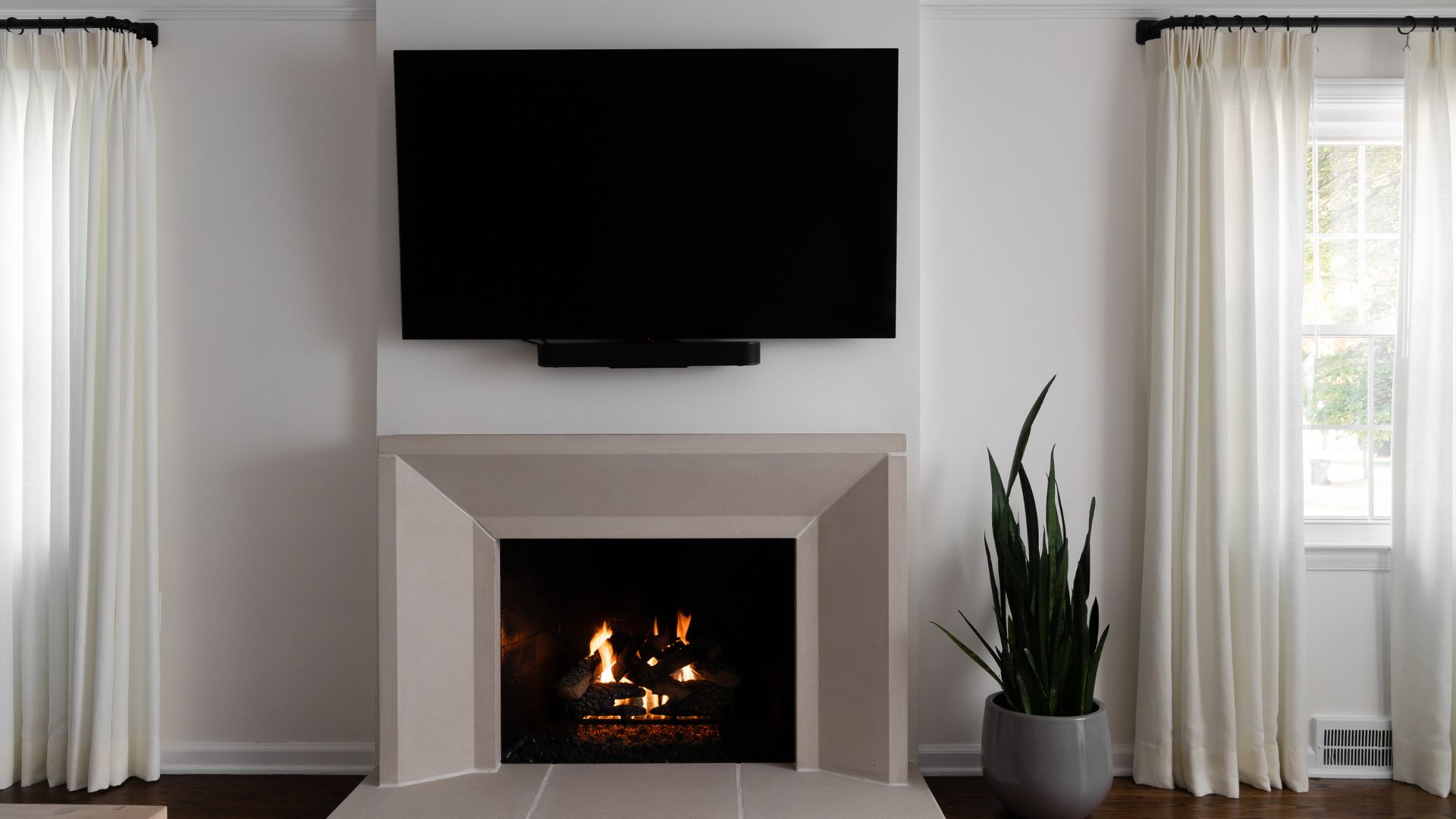 In the living room, Amareaux introduced a custom geometric fireplace surround in a neutral stone finish. A mounted television keeps the look clean while allowing the fireplace to be the true focal point. Sheer white drapery filters natural light, softening the space while maintaining its airy, organic quality.