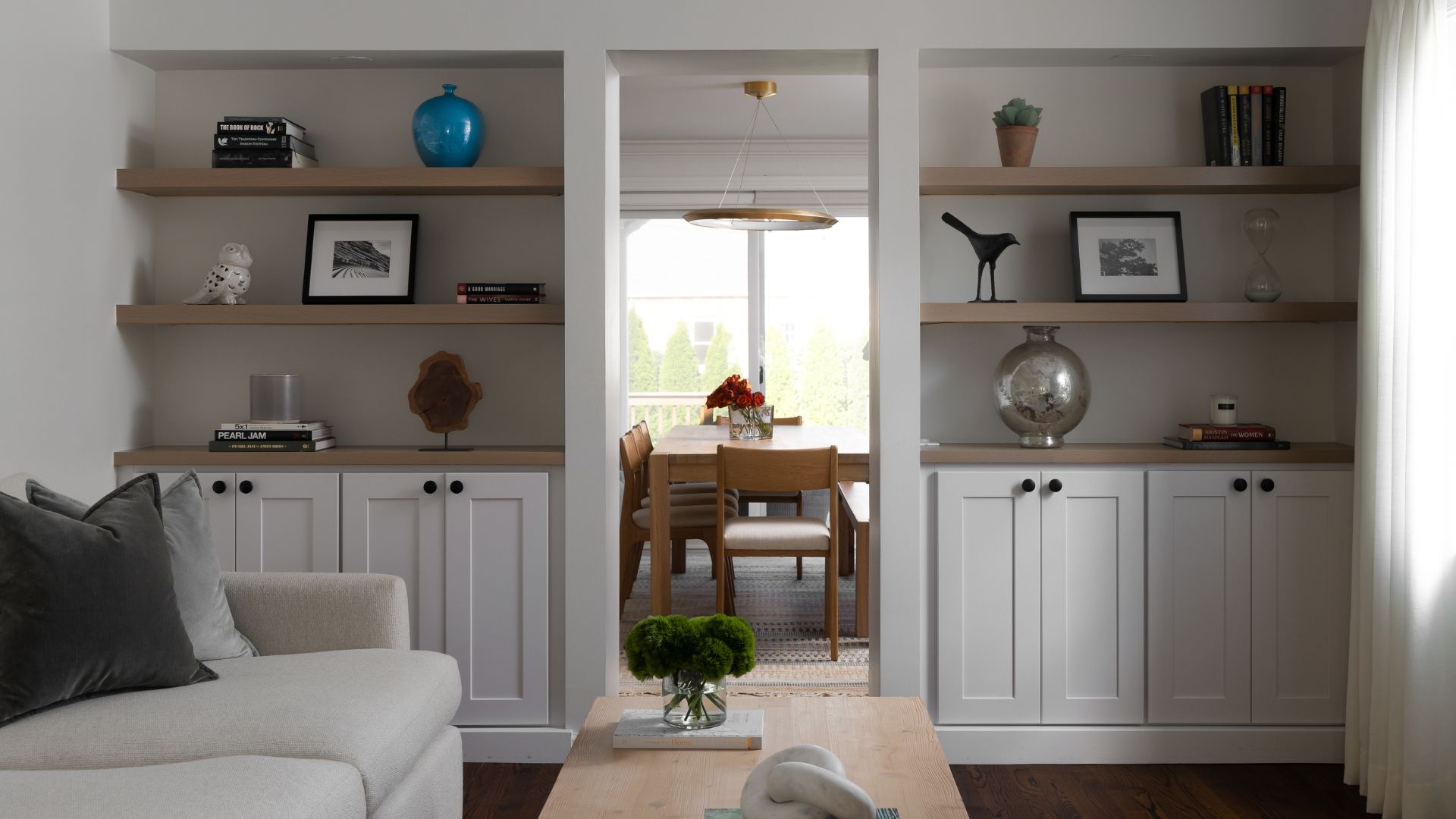 The former family room was transformed into an inviting dining room, designed for gathering and entertaining. A modern oak dining table and chairs echo the tones of the kitchen cabinetry, tying the spaces together. A sculptural pendant light, landscape artwork, and fresh florals add warmth and refinement, achieving a balance between minimalism and comfort.